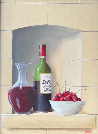 Fles en karaf rode wijn en schaaltje kersen.jpeg