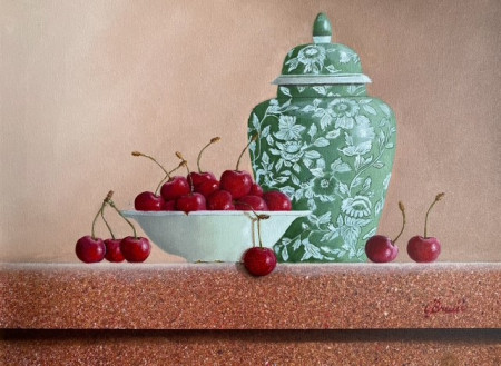 Groene Chinese vaas met kersen in een kom.jpg