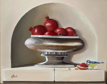 Stilleven met zilverkleurige schaal met granaatappels en pimpelmeesje.jpeg